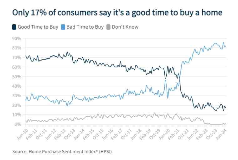 A slowing economy, weakening labor market and still-elevated home prices have created a toxic mix of unaffordability in the housing market. Fannie Mae Home Purchase Sentiment Index (HPSI) sums up the predicament for most prospective buyers. Yes, there are plenty of available homes. The problem is that many Americans can simply no longer afford the prices. Only 17 percent of July survey respondents thought it was a good time to buy a home in July. In contrast, 65 percent of survey respondents believed it was a good time to sell.
