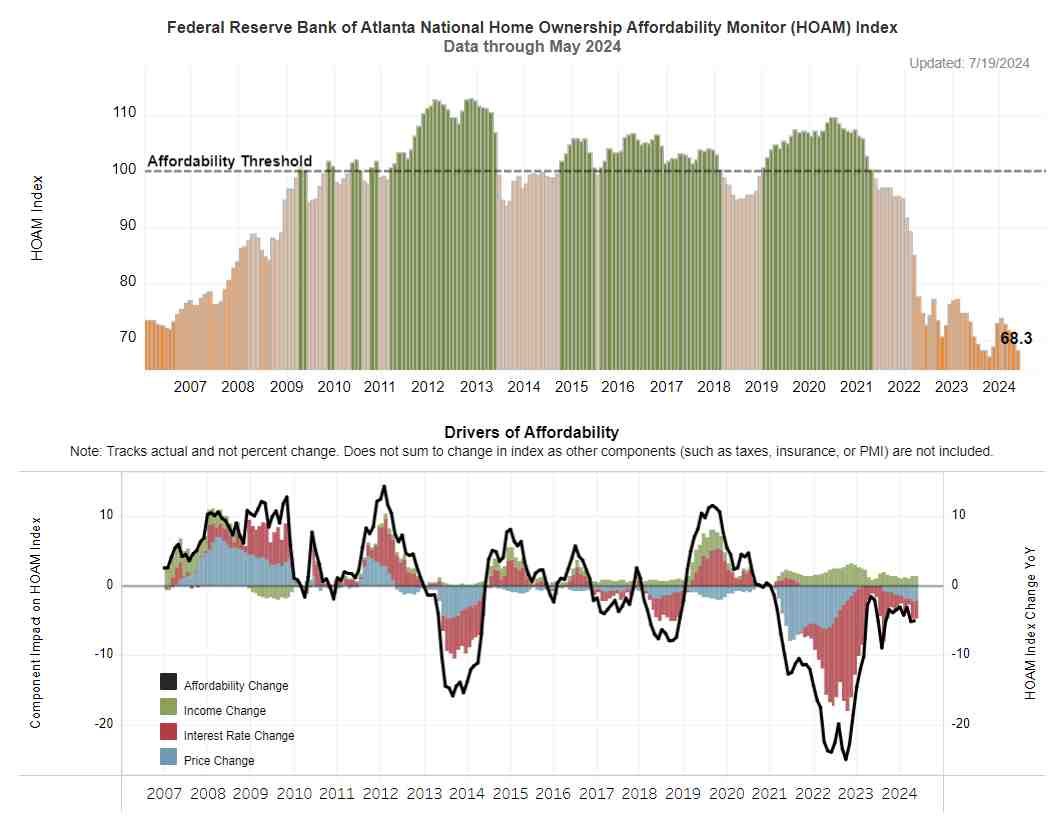 The Atlanta Fed’s Home Ownership Affordability Monitor just confirms what prospective buyers are facing. Despite a slight drop in mortgage rates into the six percent range, home affordability remains a major hurdle for many Americans. The latest reading with lagged May data showed a median payment for the median U.S. home at $2,977. That payment represents nearly 44 percent of the median monthly U.S. income, and well above the conservative ratios for debt-to-income limits.