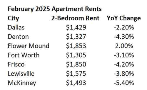 A soft rental market has provide a bit of relief for North Texas home shoppers. Apartment List shows average rents down 4.3 percent from a year ago in the City of Denton. Other DFW suburbs also show lower year-over-year rents.